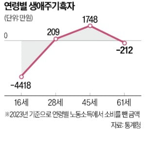 한국인의 인생…28세 첫 흑자, 45세 수입 정점, 61세 다시 적자