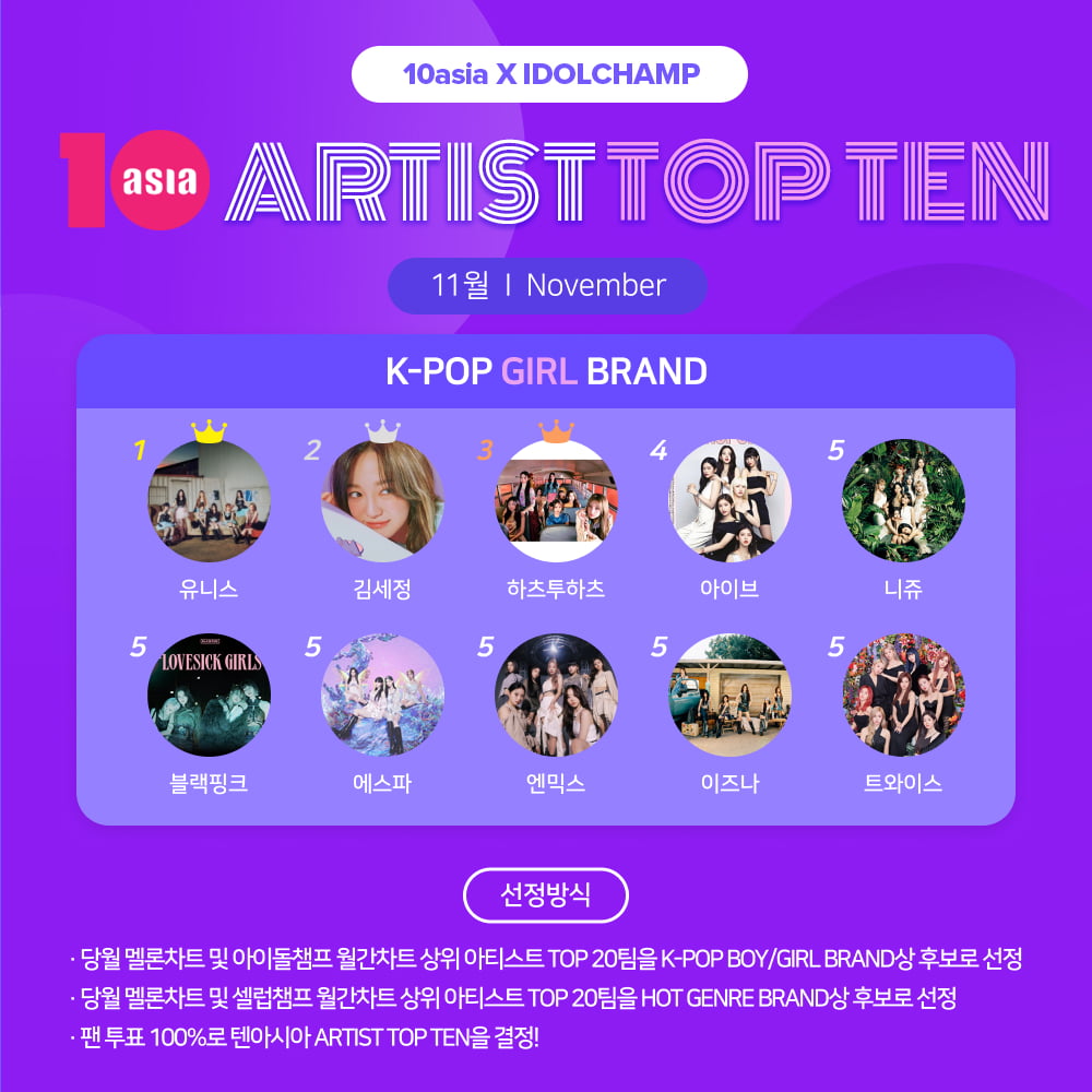 유니스·김세정·하츠투하츠, 11월 '아티스트탑텐 K-팝 걸 브랜드' 주인공