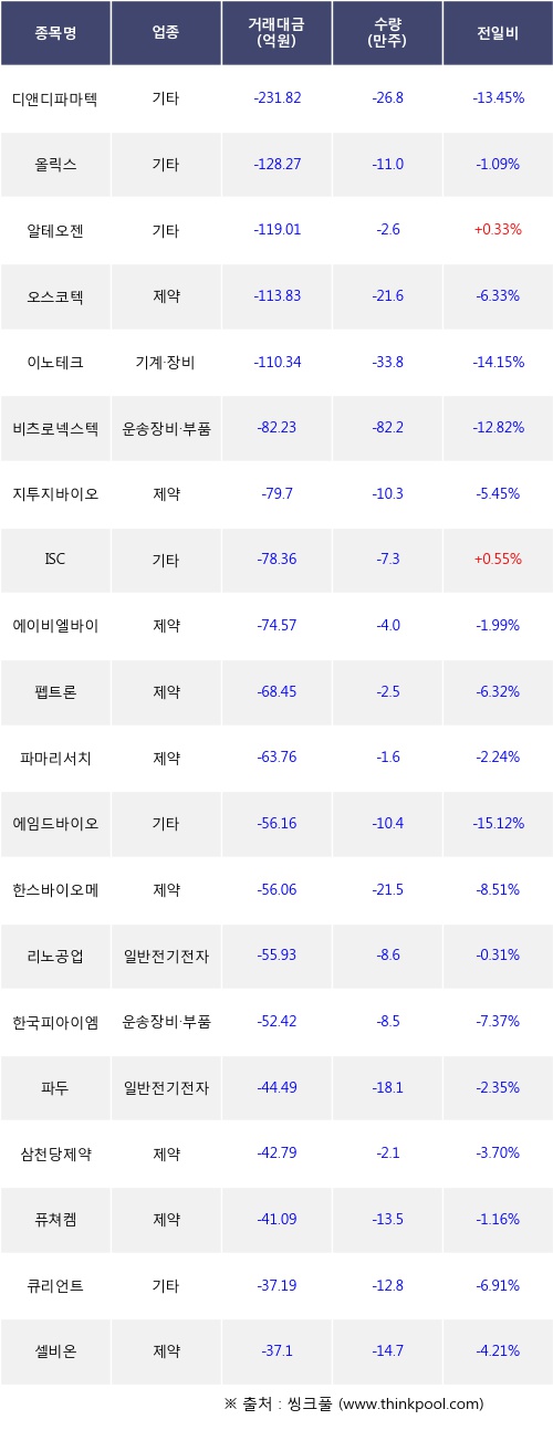 21일, 외국인 코스닥에서 알테오젠(-2.87%), 펩트론(-4.4%) 등 순매도