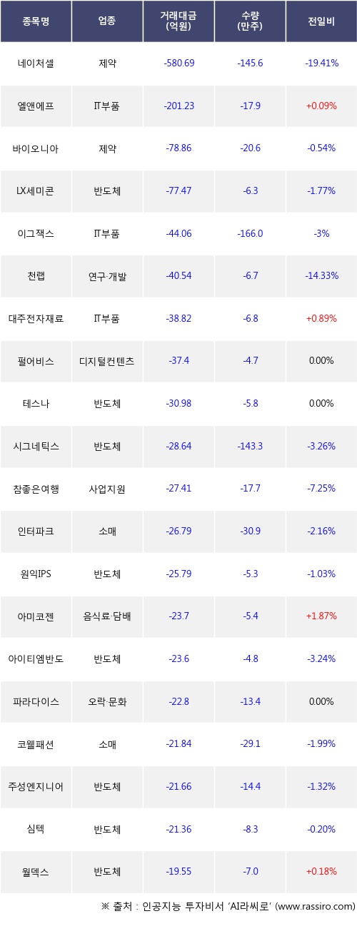 23일, 외국인 코스닥에서 네이처셀(-19.41%), 엘앤에프(+0.09%) 등 순매도