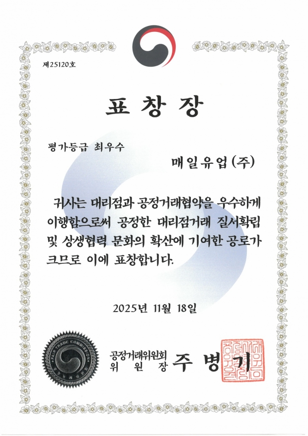 매일유업, 5년 연속 '대리점 동행기업' 선정 및 최우수기업 표창 수여받아